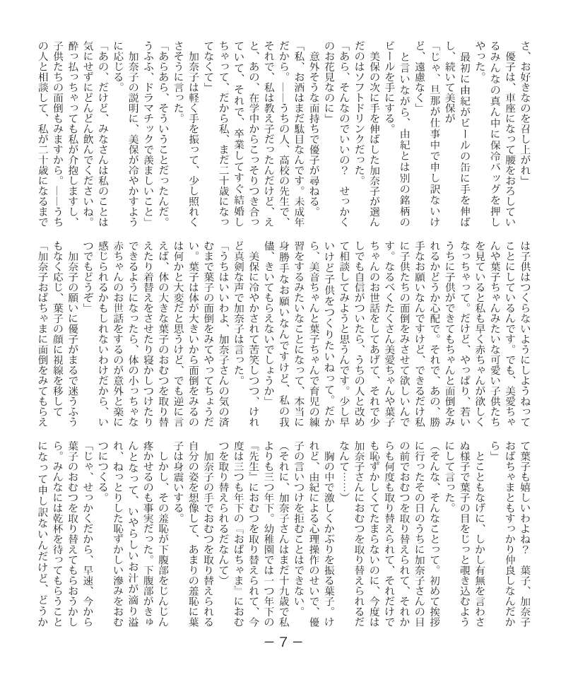 そういえば、昔から気になっていたのですが、「家族の肖像」は「オシメっ子さんの小説に高木が勝手に続きを付けるシリーズ」に存在していますが、序盤は「オシメっ子さん」が書かれたものなのでしょうか?
