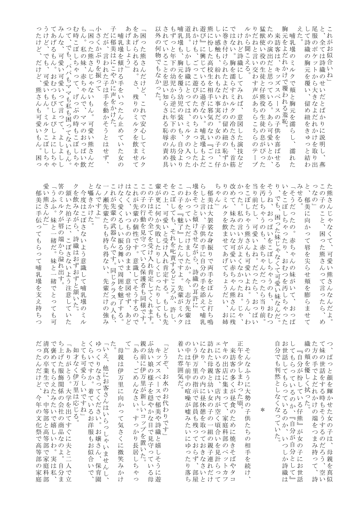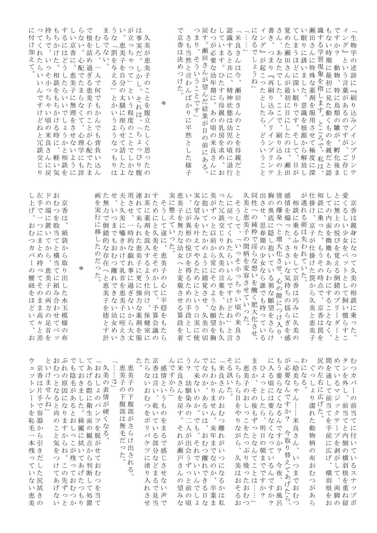 理事長から生まれたのは女の子。男子大学生は、(血縁上はその女の子の父親であるにもかかわらず)理事長の思いを存分に受け継いだ女の子にかしずく(執事でさえなく)丈の短いスカートの裾からおむつカバーを見え隠れさせる羞ずかしいメードとして、あるいは、同性の遊び相手を欲しがる女の子の幼い妹として、あるいは、生きたミルク飲み人形として、いつ終わるとも知れぬ長い囚われの生活を送ることを余儀なくされるのだった